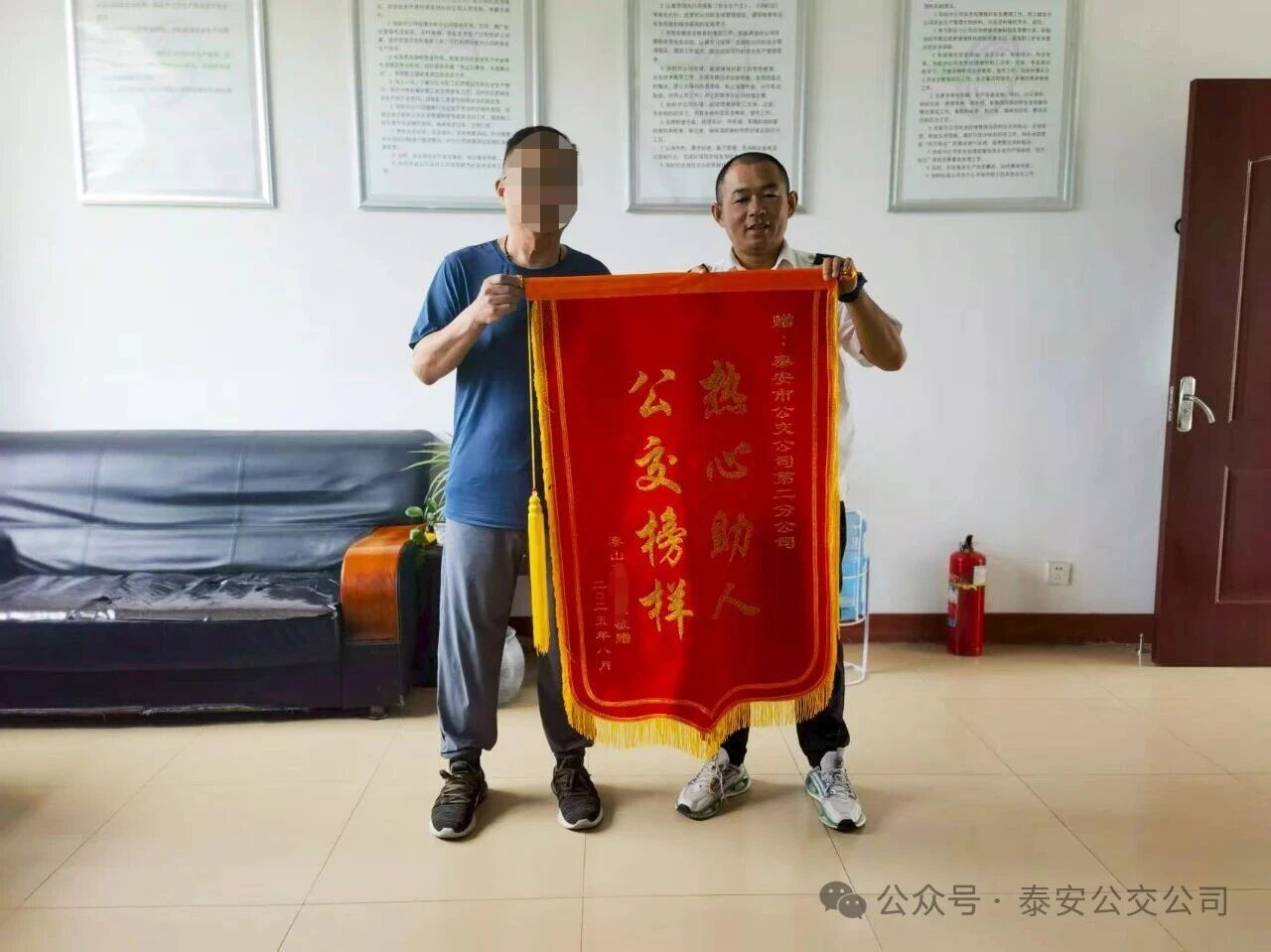 94日下午,泰安公交第二分公司辦公室迎來(lái)了一位特殊的訪客——市民方先生。他手捧一面鮮艷的錦旗,專程前來(lái)尋找并感謝曾在危難之際向他伸出援手的兩位公交人:分公司保衛(wèi)值班人員李潛和26路駕駛員李斌。